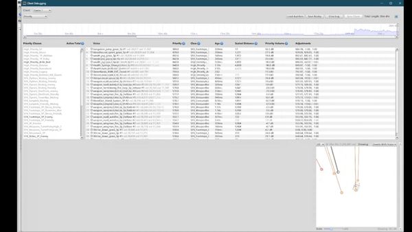 Es gibt mehrere Methoden, um den Spielmix dynamisch zu beeinflussen, damit er wichtige kritische Geräusche bei Bedarf hervorhebt. Unsere einfachste Methode, während des Spiels Änderungen an der Balance vorzunehmen, nennen wir "Mix-Snapshots", und wir modifizieren damit Lautstärke und hörbare Distanz einzelner Geräusche bzw. ganzer Geräuschkategorien.