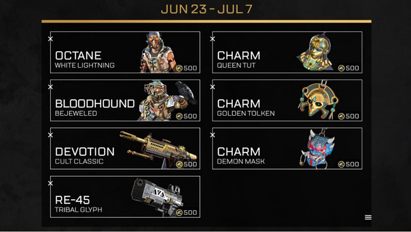 New to this event we’re introducing a second ‘SpecialOffers’ tab. This page introduces 7 additional cosmetics at a lower price point of 500 Apex Coins. These are event limited so they will not be eligible to return for at least another 6 months; however, these items do not count towards your 24 item collection. They will be available for the duration of the event.