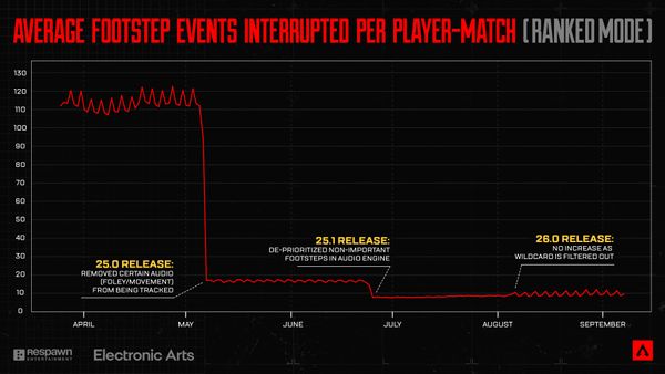 Back with the launch of Season 25, we added a feature that prompts you to submit audio logs from matches where an unusually high number of audio footstep cancellations were detected. Your submissions allow us to replay audio logs and debug a 1:1 recording of game related sounds that happened inside of our audio engine throughout the course of that match. Using this data, we’ve already made meaningful improvements such as rebalancing prioritization of less important events (ex. downed footsteps) and this is just the beginning. Please continue to send your logs when prompted to help us with data collection, fixes, and improve the auditory experience in the Outlands for all.