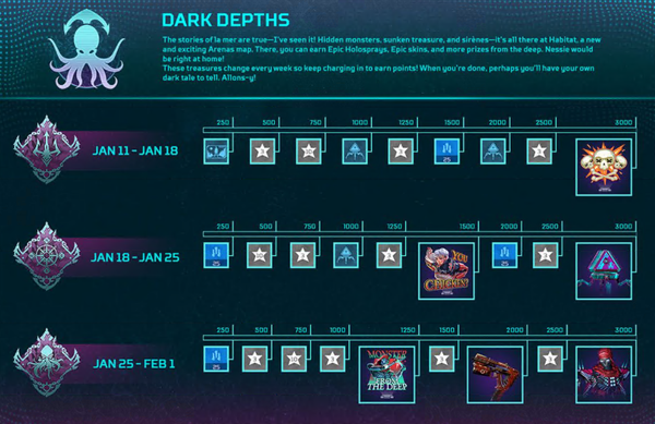 Flash Events during Dark Depths are essentially individual prize tracks per week. So each week there will be a new set of unique prizes + 1 unique badge players can earn by completing challenges. Here’s a look at some of the rewards that will be available each week.