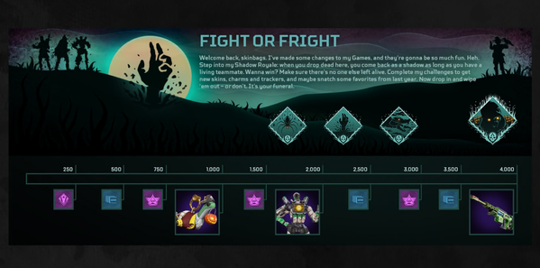Fight or Fright is back! Terrorize your enemies in the “Shadow Royale” LTM on Kings Canyon After Dark. Fallen squadmates come back as Shadows with unnerving speed. Use your wits, deadly claws, and revives to keep the rest of your squad alive. Plus complete challenges to earn haunting free rewards and visit the store for new and rethemed classic Halloween cosmetics. Here’s everything you need to know about this year’s Fight or Fright Event, running from October 22 to November 3.