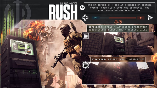 In einer Rush-Partie kämpfen das angreifende und das verteidigende Team um die Kontrolle über mehrere militärische Funkstationen. Das angreifende Team muss an allen Funkstationen Sprengsätze anbringen. Nach einer vorgegebenen Zeit (standarmäßig 30 Sekunden) explodiert die jeweilige Funkstation. Außerdem hat das angreifende Team nur eine bestimmte Zahl von Leben, mit denen es haushalten muss, während es versucht, seine Ziele zu erreichen.