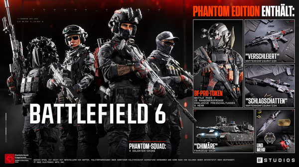 Battlefield 6 ist als Standard Edition (UVP $69,99) und als Phantom Edition (UVP $99,99) erhältlich. Die Phantom Edition enthält den BF Pro-Token, Phantom-Squad-Soldaten-Skins, Waffenkonfigurationen, einen Deluxe-XP-Boost und mehr, zusätzlich zum Download der Vollversion von Battlefield 6.