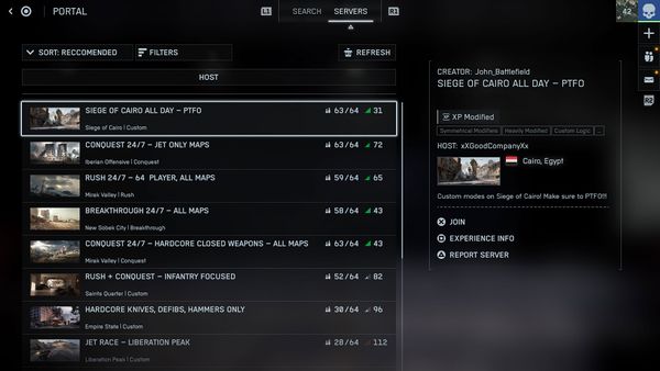 Ist ein eigenes Portal-Community-Erlebnis ausgewählt, erhalten alle Spieler:innen nicht den Standardfortschritt für Karriere-XP, Hardware-XP und Aufträge. Stattdessen erhalten sie eine Karriere-XP-Spiel-Abschlussbelohnung, die höher ist als eine vergleichbare Auszeichnung für den Abschluss eines Multiplayer-Spiels. Eigene Portal-Community-Erlebnisse sind deutlich als mit "Modifizierte XP" markiert, um Verwechslungen vorzubeugen.