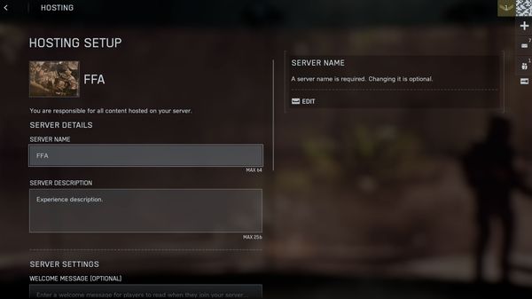 Wähle nach der Wahl eines Community-Erlebnisses "Hosten", um einen weiteren Bildschirm mit mehreren Optionen aufzurufen. Die erste Option ist der Server-Name und eine Beschreibung. Beides sollte im Rahmen der zulässigen Zeichenzahl möglichst präzise sein, um Spieler:innen auf deinen Server zu locken. Weiter geht es mit optionalen Begrüßungen und regelmäßigen Nachrichten, die während des Spiels und beim Beitritt einer Person zu deinem Server angezeigt werden.