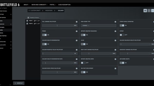 Soldaten-Modifikatoren umfassen Optionen wie die Deaktivierung von Funktionen wie Bauchlage, Zielen über Visier, Seitschritte beim Sprinten und Gesundheitsregeneration. Außerdem kannst du den Schaden justieren und unbegrenzt Munition gewähren.