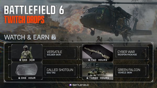 To earn these Twitch Drops, you should first make sure your EA and Twitch accounts are linked HERE. Then, during Battlefield 6’s launch week - October 10 at 8 a.m. PT to October 17 at 11:59 a.m. PT - head to your favorite creators streaming Battlefield 6 to unlock a Weapons Package, a Soldier Skin and more. Once you complete the Twitch Drop objective with your linked account, claim it on Twitch before logging into Battlefield 6 to receive your reward.