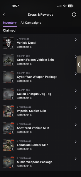 To earn these Twitch Drops, you should first make sure your EA and Twitch accounts are linked HERE. Then, during Battlefield 6’s launch week - October 10 at 8 a.m. PT to October 17 at 11:59 a.m. PT - head to your favorite creators streaming Battlefield 6 to unlock a Weapons Package, a Soldier Skin and more. Once you complete the Twitch Drop objective with your linked account, claim it on Twitch before logging into Battlefield 6 to receive your reward.