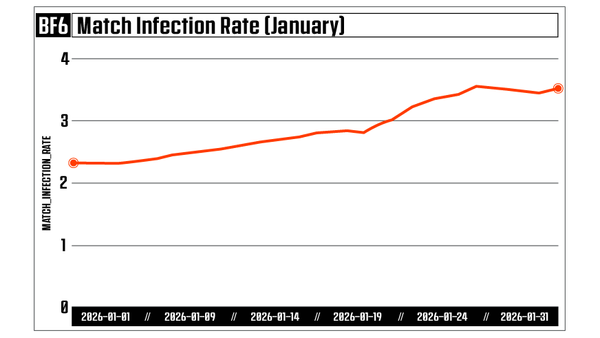 Match Infection Rate: odsetek gier w ramach tytułu, na które negatywny wpływ miał co najmniej jeden oszust. Obejmuje to wszystkich graczy podejrzewanych o oszustwa, nawet tych, wobec których nie mamy wystarczających dowodów, aby podjąć działania.