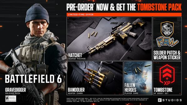 Reserve o Battlefield 6: Edição Phantom e receba o BF Pro Token, texturas de soldado do pelotão Phantom, pacotes de armas, reforço de EXP Deluxe e muito mais, além de poder fazer o download completo do Battlefield 6. As reservas da Edição Phantom e da Edição Standard também incluem o Pacote Lápide, que contém uma textura de soldado e um Kit de reforço de EXP de Lápide.