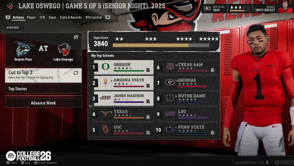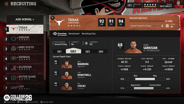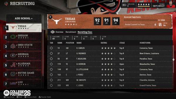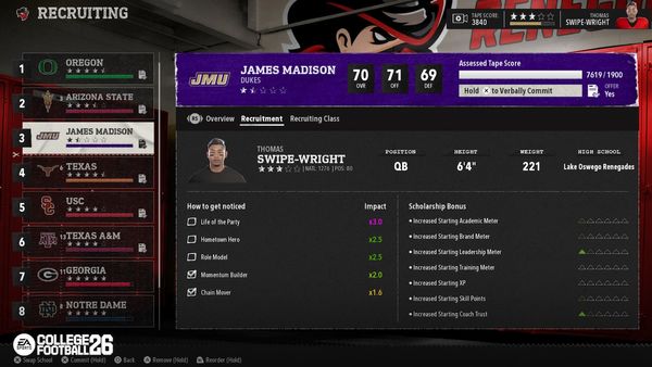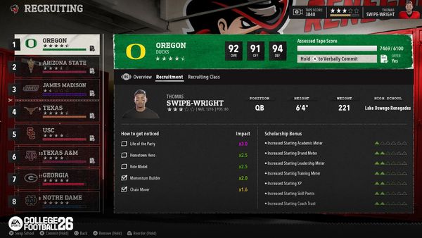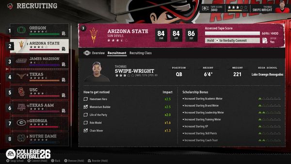 You can manage your board at any time from the My Recruitment action in the High School hub. You’re allowed up to 10 schools on your list, and you can add, remove, or swap them out based on your evolving recruiting picture. When browsing new schools to add or swapping one out, you’ll be able to view each program’s full assessment of your Tape Score to see where you stand before making a decision. You can also reorder your board anytime by holding R2/RT to keep your priorities in check.
