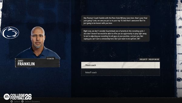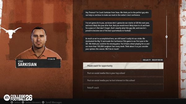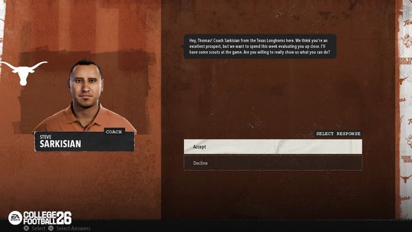 Scenarios also evolve dynamically based on your location, playing time opportunity, and in-game performance. A coach’s interest in you can rise or fall week to week. They’ll even adjust their messaging — advocating for their program by pointing to a winning season, a dip in your other top schools’ performance, or the prestige of their university compared to your other options.