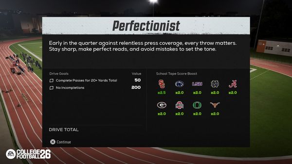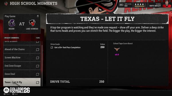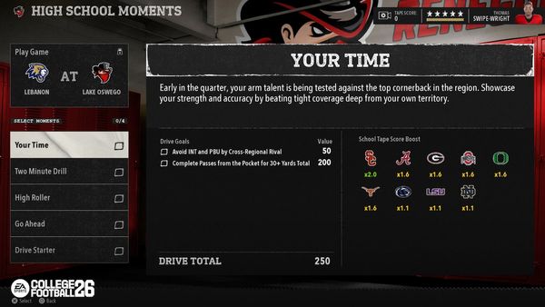 Your performance in these moments directly shapes your Tape Score. Each drive is an opportunity to demonstrate your execution, decision-making, and ability to rise to the moment. The more goals you complete, the better your tape — and the more schools will take notice.