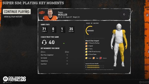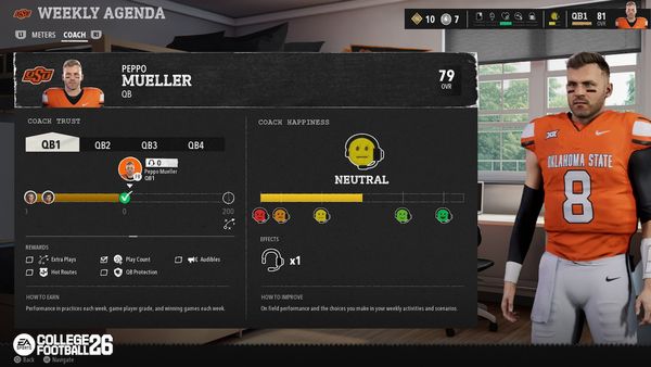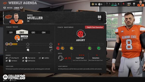 Coach Happiness fluctuates week to week and game to game. If it’s high, you’ll progress through Coach Trust faster. If it drops too low, your Coach Trust slows, you may begin to lose trust each week, and if things get bad enough, you could be benched or demoted entirely. Once you’ve lost your depth chart spot, you’ll need to compete in a Position Battle to earn it back — but your coach won’t even consider giving you another shot until your happiness rating has returned to neutral.