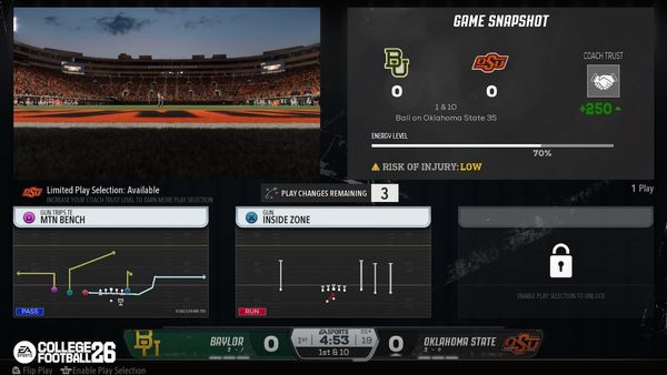 Once you’ve selected your four moments for the week, it’s time to take the field. Before each drive begins, you’ll see a banner that sets the stage — outlining the situation, your drive goals, and how different schools view the moment. But once the whistle blows, it’s on you to execute.