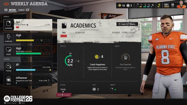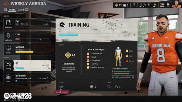 Second, you’ll set your Weekly Agenda, deciding how to spend your time off the field. Focus on academics to stay eligible and unlock mental abilities, hit the weight room to improve your physical attributes, or socialize to build your brand. You can also spend time with teammates to develop leadership or recover to maintain your health through the season.