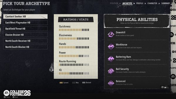 For example, Halfback now includes six archetypes. You might be an East/West Playmaker, a shiftier back who can create space and generate big-play moments, or an Elusive Bruiser, who combines agility in the open field with downhill physicality. Each archetype comes with its own starting attributes, skill group caps, and a curated set of physical abilities tailored to your style of play.