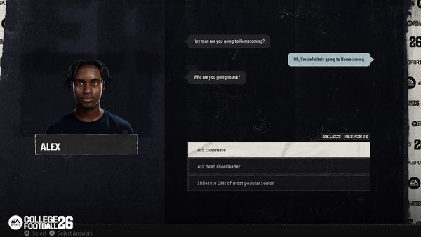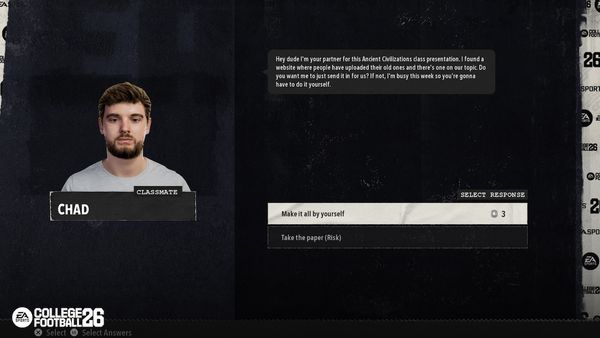 Scenarios are triggered based on the decisions you make and how you choose to spend your time off the field. Some dilemmas will be actual conflicts with real consequences like whether to skip class for a short-term gain knowing there’s a chance you’ll get caught, or whether to steal your teammate’s date, which might give you a boost but risk creating tension in the locker room. As we said from the beginning, there are no right or wrong answers, only the path that you create.