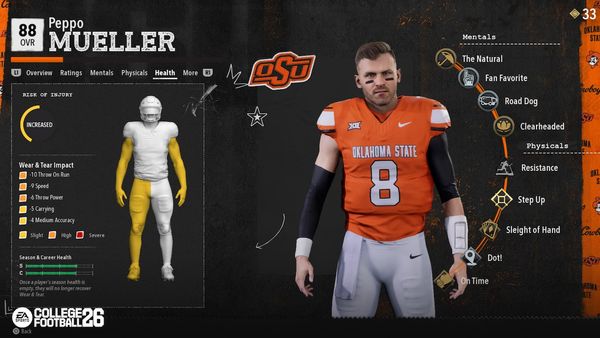 In College Football 26, Road to Glory introduces season and career health pools. These track how much wear and tear damage you can recover in a single season and across your entire career. Every time you take steps to recover, it pulls from these pools. Once your season health pool is depleted, you won’t be able to recover further until the offseason when your body fully heals.