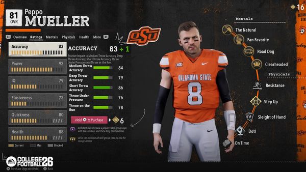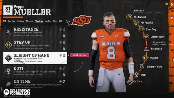 The ability you start with is determined by your archetype. A Pocket Passer quarterback begins with Step Up and Dot, while a Pure Runner starts with Magician and Workhorse. But that early edge isn’t guaranteed to last. Just because you start as a 5-star doesn’t mean you can’t finish as a 2-star — and just because you start as a 2-star doesn’t mean you can’t climb all the way to 5-star status. Maintaining a top rating will require near-perfection throughout your high school journey.
