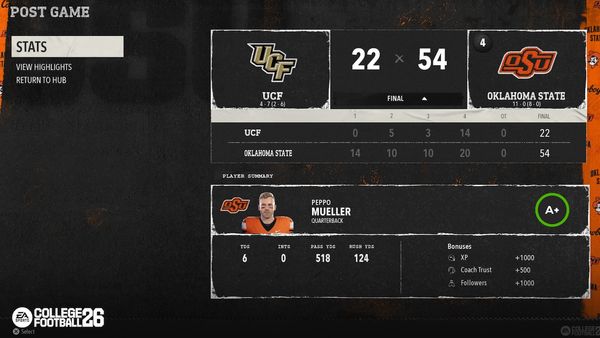 In College Football 26, we have expanded the integration between Road to Glory and Madden NFL 26 Superstar mode. This is a story and a journey that stretches from Friday to Saturday to Sunday, across two games, and one player. See the Madden NFL 26 Superstar deep dive for more details (EA account, internet connection, and all game updates required).