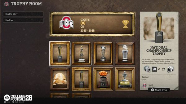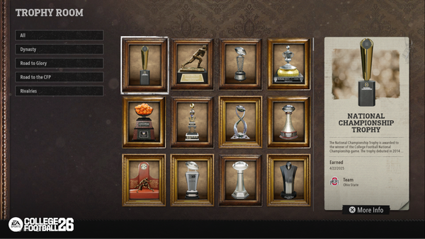 Each Road to Glory character has its own Trophy Room, tied specifically to that player. Team-based trophies include full context: season, team, opponent, and final score. Individual awards show your name, team, and the year you brought home the hardware. You can even select a trophy to learn more about its history and significance in college football.