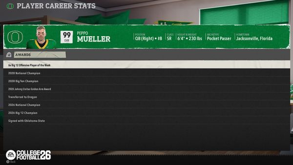 In addition to College Football History, you can now view all of your awards and accolades from your player card. Within the player card, go to the more tab and then stats. Once you are within the stats screen filter to Awards. This will show all of your individual awards like Heisman Trophies, conference championships, national championship, All-American and All-Conference selections, how many times you have been national and conference player of the week, and your transfer history.