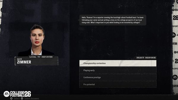 Your Road to Glory officially begins with your first media moment — an interview with local reporter Alice Zimmer, who’s covering your rise as a high school prospect. Alice kicks off your recruiting story by asking a critical question: what motivates you when choosing a college? Whether it’s academics, championships, playing time, or something else entirely, your answers help define the kind of programs that will be most interested in you. Schools will evaluate your fit based on how well your motivations align with their My School grades, which will start to determine which programs are most likely to pursue you early in your journey.