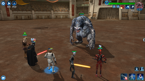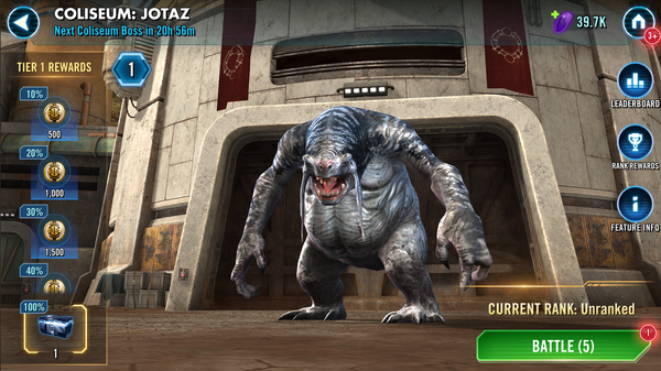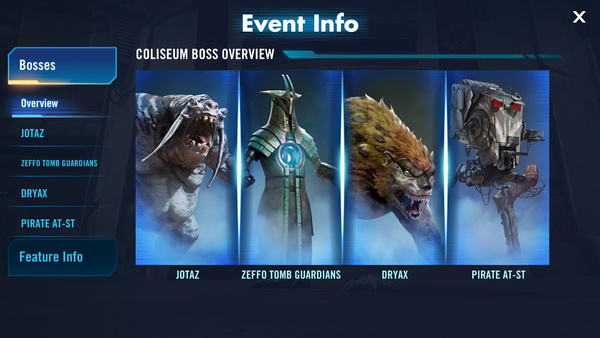 Coliseum is a new game mode and the first Era mode to be added to Star Wars: Galaxy of Heroes. Unlocking at Player Level 10, this game mode pits individual players against formidable foes from the Star Wars universe. Bosses will rotate daily, with players attempting to achieve new high scores each day. These high scores will earn rewards in two ways: one-time rewards for reaching certain score milestones (that reset each era) and daily leaderboard rewards competing against other players’ high scores for the day.