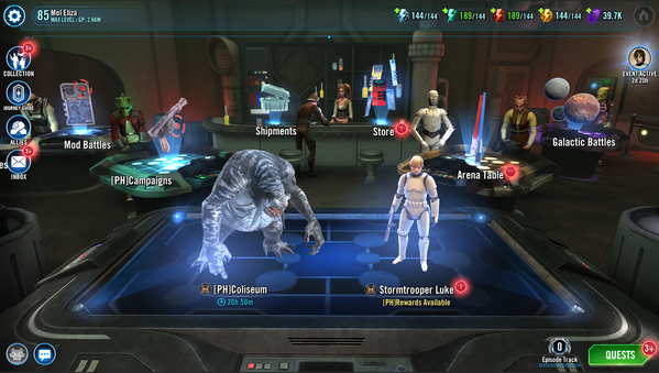 We have long wanted to spice up the cantina with new characters, story elements, tie-ins to current events within Galaxy of Heroes, and more. While our Art team is hard at work preparing larger changes, we wanted to put seasonal content front and center. To facilitate this, we’ve condensed the Light Side and Dark Side tables into the Cantina Battles table and renamed it the Campaigns table.