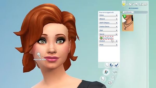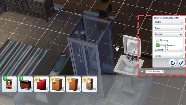 - Wähle das Spezial-Dropdown-Menü und setzt ein Häkchen bei den Event-Belohnungen. Dadurch wird "Erstelle einen Sim" gefiltert, sodass nur Belohnungsobjekte in jeder Kategorie angezeigt werden.