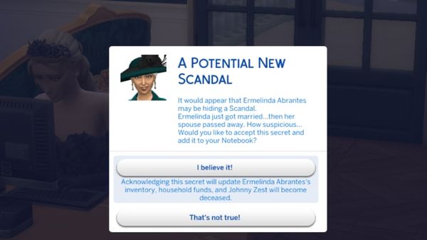 Für den Fall, dass ihr etwas mehr Spannung im Spiel wollt, generiert das Spiel zudem weitere Geheimnisse. Dann erhaltet ihr einen Prompt in Form von Tratsch über einen anderen Sim. Ihr entscheidet, ob diese Vermutungen wahr sind oder nicht. Wenn ihr euch entscheidet, die Vermutung zu glauben, wird sie zu einem Geheimnis, das reale Konsequenzen für den betreffenden Sim hat.