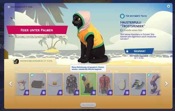 Jasmine teilt während des Events ein paar besondere Geschenke mit uns wie etwa den Haustierpulli "Trostspender" für Hunde und Katzen (so süß!). Genieße noch mehr Inhalte in Packs, die du bereits besitzt!