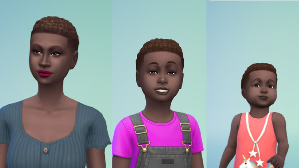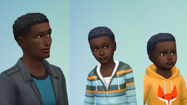 Dann wäre da noch die fantastische Frisur Hair_EF13AfroShort, die wir "Kurzer Afro" nennen. Auch davon habe ich unten ein paar Screenshots von weiblichen und männlichen Erwachsenen, Kindern und Kleinkindern mit dieser Frisur hinzugefügt. Wir haben bereits bemerkt, dass das Farbmuster "Schwarz" bei dieser Frisur in den Screenshots unten eher grau aussieht, und wir werden diesen Fehler mit einem zukünftigen Update beheben.