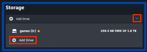 Para alterar o local dessa biblioteca dentro do Steam, vá em Steam > Configurações > Armazenamento, clique na seta à direita do nome da unidade e depois no botão + Adicionar unidade.