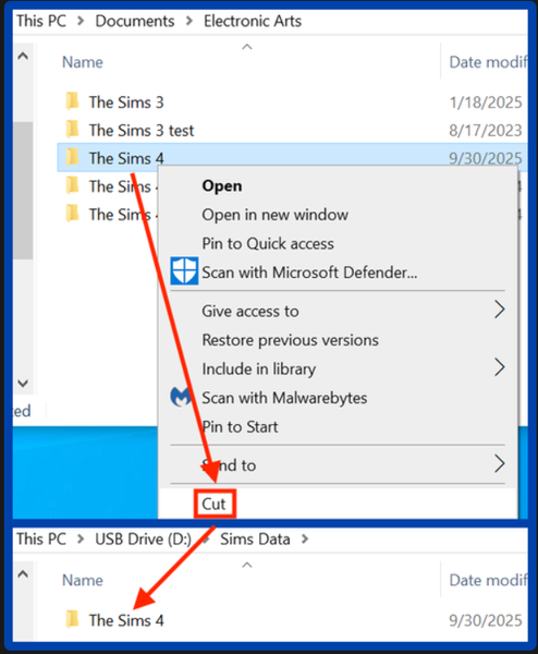 No entanto, se sua velocidade de download for baixa e reinstalar for complicado, é possível tentar um procedimento alternativo. Feche o EA App e verifique no Gerenciador de Tarefas se o EABackgroundService não está em execução. Clique com o botão direito na pasta do The Sims 4 que contém os arquivos de programa e selecione Recortar. Depois, clique com o botão direito em um espaço vazio dentro da pasta de destino e selecione Colar. Aguarde a conclusão da transferência, o que pode levar algum tempo.