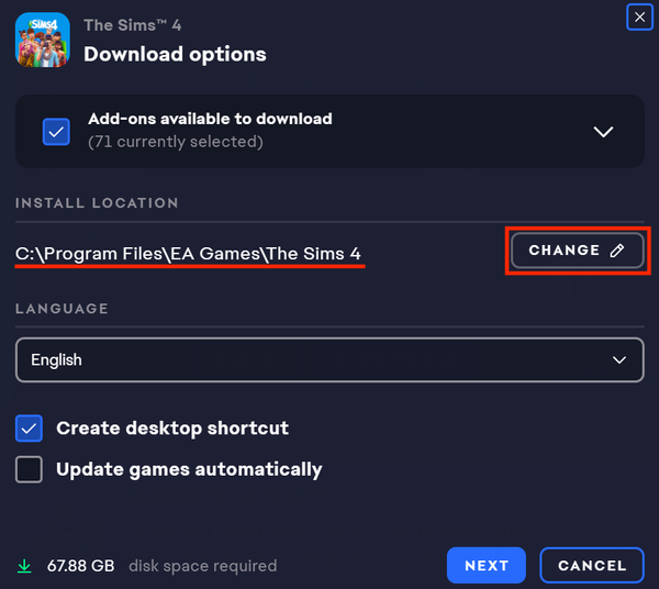 O EA App instala todos os jogos em C:\Program Files\EA Games por padrão, mas durante o processo de instalação você pode selecionar uma pasta diferente na opção Local de instalação.
