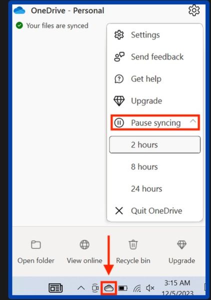 Remova essa pasta e, se necessário, pause a sincronização do OneDrive. Clique com o botão direito no ícone de nuvem no canto inferior direito da tela, ou no ícone da bandeja do sistema, para acessar essa opção.