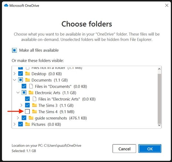Se quiser fazer isso de forma mais específica, pode haver a opção de escolher não sincronizar o conteúdo da pasta Electronic Arts, da pasta The Sims 4 ou de qualquer pasta interna. Observação: essas opções não estão disponíveis para todos os usuários. Primeiro, faça um backup dessa pasta; como mencionado acima, você pode salvá-la em um dispositivo externo ou na pasta Downloads.