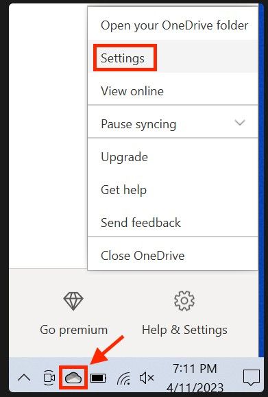 Verifique também se o OneDrive tem armazenamento suficiente para os seus dados, caso contrário você pode ter ainda mais problemas. Clique com o botão direito no ícone de nuvem no canto inferior direito da tela, ou às vezes ele fica oculto na bandeja do sistema, que você pode expandir clicando no ícone ^, e selecione Configurações:
