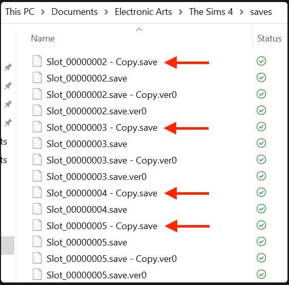 No exemplo mencionado acima, para os salvamentos afetados, seria necessário excluir “- Copy” e o espaço, além de renumerar os arquivos, já que outros salvamentos já utilizam esses mesmos números. A ordem da numeração não importa. Escolha nomes que sejam práticos para você, embora o The Sims 4 ocasionalmente não consiga ler salvamentos que começam com um dígito diferente de 0.
