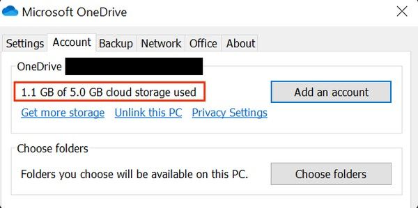Em Conta, você verá o armazenamento atual e o total disponível:4