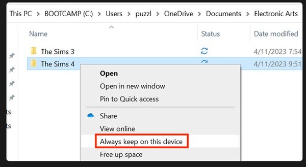 Se sua conta do OneDrive tiver espaço suficiente para todos os seus arquivos, a solução mais simples para arquivos que desaparecem é configurar o OneDrive para manter a pasta de usuário do The Sims 4 no seu computador. Clique com o botão direito na pasta e selecione “Sempre manter neste dispositivo”.