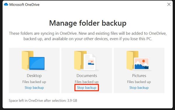 Clique com o botão direito no ícone do OneDrive no canto inferior direito da tela, selecione Configurações > Backup, clique em Gerenciar backup e clique em Parar backup nas três categorias, depois confirme a escolha.