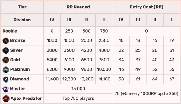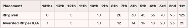 2. As a rule of thumb, for any rank except Master and Predators, players with 3 K/A and 10th placement should receive decent positive RP (50-100RP) to compensate for many times dying off-drop, 10 kills 5th placement for ~300RP, 10 kills 1st placement for 600-800RP so that they can rank up faster. So I think simply double the Awarded RP per K/A for all placement would work.
