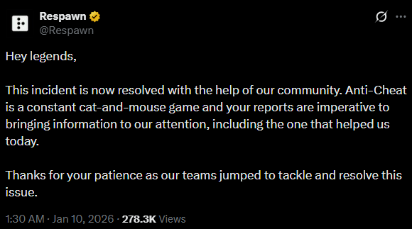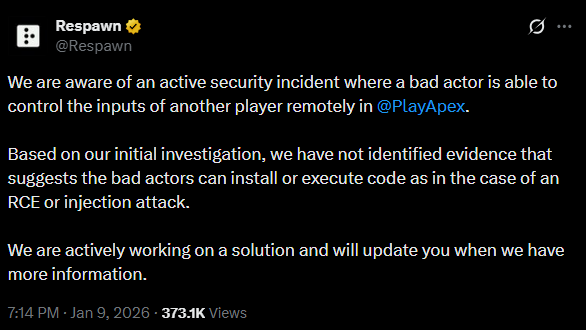 'Bad actor' hijacks Apex Legends characters in live matchesfakiiri123 The link you shared is from January 12th, 2026, which here are the official replies from Respawn about that issue: