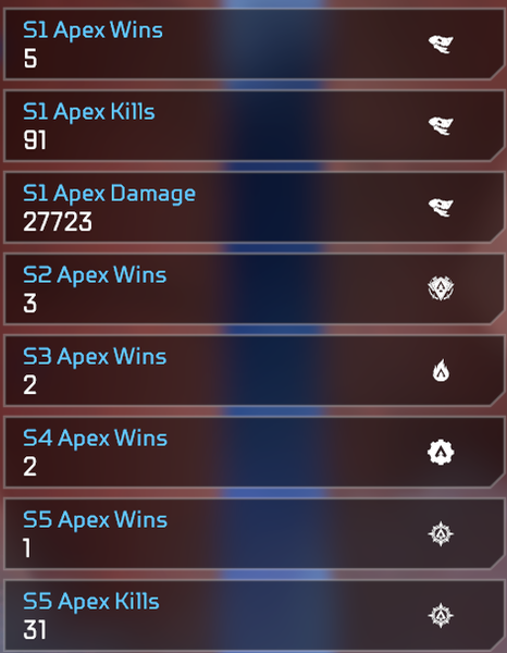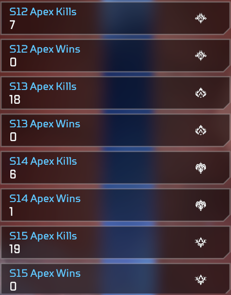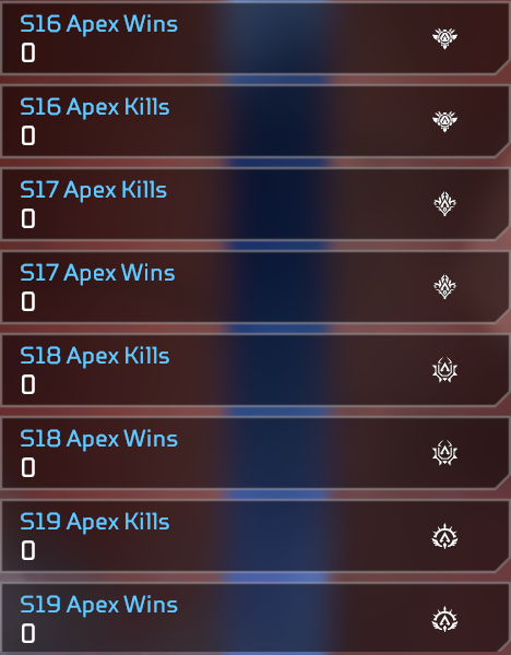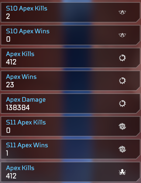 Im Grunde braucht es nur drei Hauptreiter: Legenden-Tracker (Kills, Wins, Damage etc), Event-Tracker (farblich hinterlegt) und Season-Tracker (Kills in Season 10, Wins in Season 10).