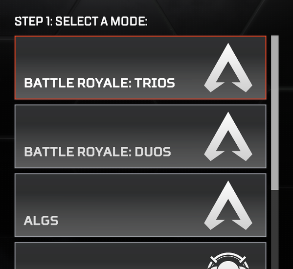 Select the game mode, (Battle Royal Trios, (or Duos), ALGS, TDM, Gun Run, Control, & Wildcard):