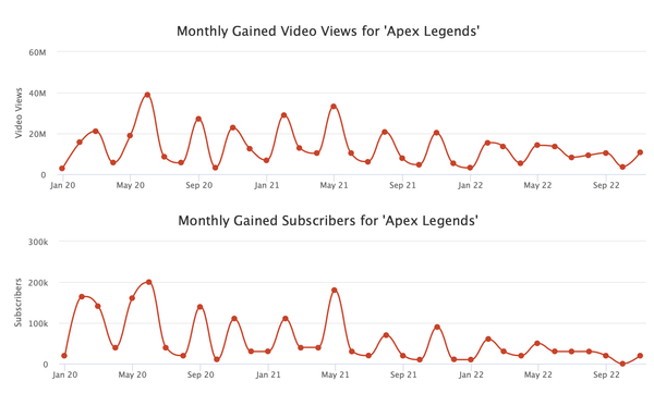 This one is the trend from the anniversary season to the present. All time high peak players were recorded in August but slowly declined afterwards. Apex's numbers were climbing up non-stop from December of 2021 until the end of August. The end of July had the ALGS championships and S14 started early August with the main feature of the updated KC and Vantage.