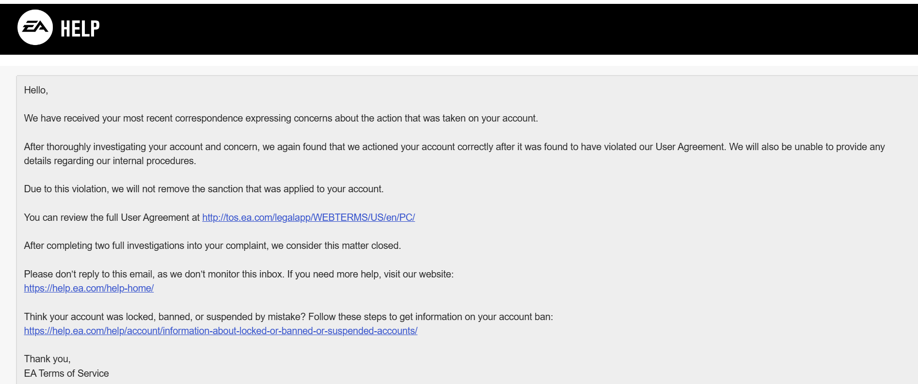 So, here is my current situation. On May 15th, when I was playing apex, I suddenly got banned for no reason. Thus, I checked through both my email and online ea ban history, and I found out I didn't receive regarding ban in my email and my ea online ban history. Therefore, I contacted ea help and chat with them. One agent helped me verify I am the owner of the account and told me that I have no ban history and no ban was found in my account. However, I couldn't log in to lobby. Once I log in to lobby, I got kicked out and said this account's has been banned. BUT! I found out I can still play apex on ps5 which is console. It's really frustrated me for this issue. I never use cheats on my account so I still can't figure out why I am getting banned and EA customer service still not able to unban my account and let me play on PC. Does anyone have this issue too?